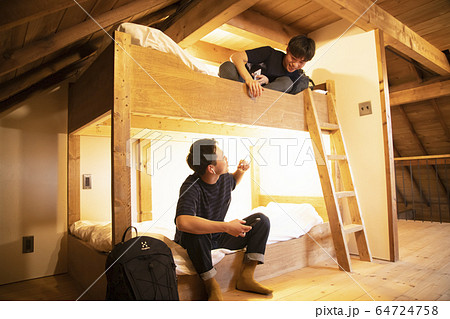 民泊の2段ベッドで過ごす若者