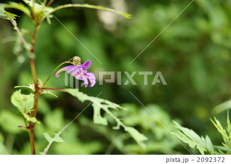野の花・紫のツリフネソウの仲間キツリフネの花の後姿・横位置