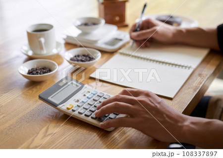 コーヒーの原価を計算するアジア人男性