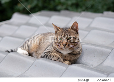 日が差す前の夏の早朝に瓦屋根で横になって訝しげな表情でこちらを見るキジトラ猫