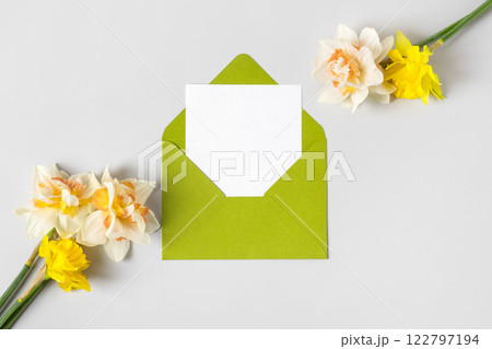 Green envelope with clean white sheet of paper for your text and spring flowers white tulips and daffodils on gray background. Invitation to the holidays. Hello spring