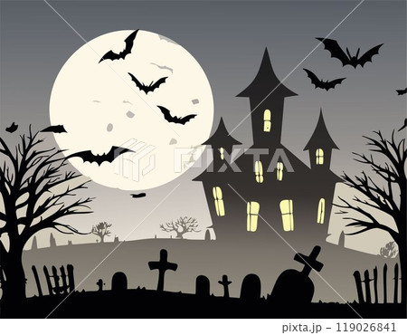 A haunted house stands ominously beneath a full moon, with crooked windows glowing faintly. A winding path leads through a graveyard surrounded by twisted, barren trees. A bat flies across the eerie,