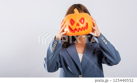 Young Asian female balancing an orange pumpkin with a cheerful smile, all amidst a backdrop of charming ghost pumpkins, creating a festive Halloween atmosphere. Halloween Day Concept