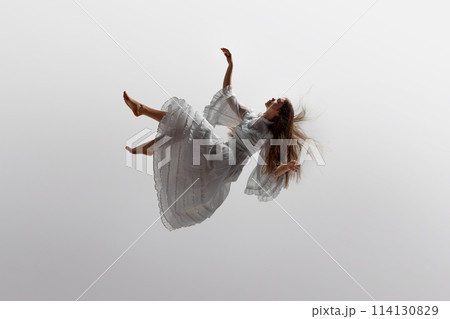 Woman in white ruffled dress floats effortlessly in moment of graceful falling in mid-air against white studio background.