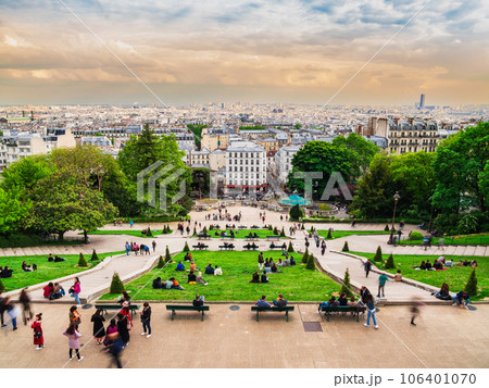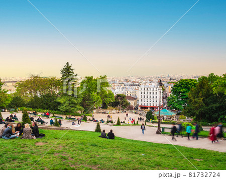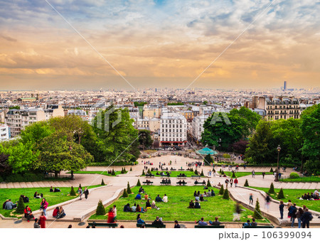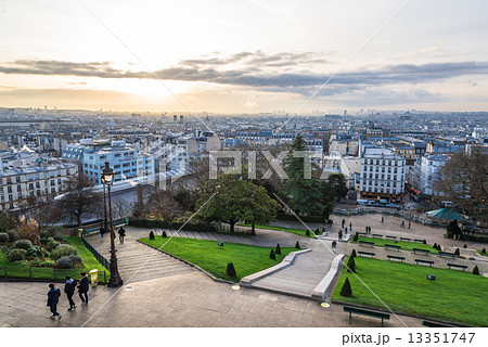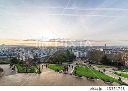 モンマルトルの丘から眺める夕暮れのパリ ワイド