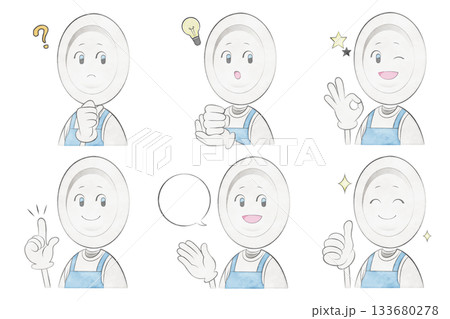 エプロンをつけたお皿のキャラクター(ポーズセット)