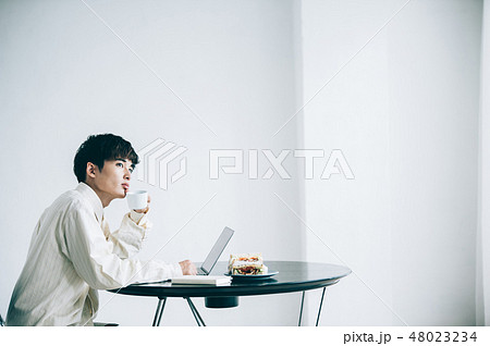 マグカップを手に窓際にもたれる男性