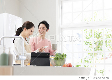 キッチンで料理する妻と仲良く話す夫