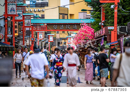 日本の東京都市景観 東京・浅草寺・伝法院通り(伝法院通)・マスク姿が目立つ=7月26日・4連休最終日