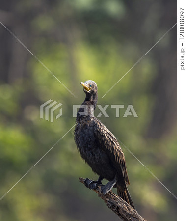 wild indian cormorant or Indian shag or Phalacrocorax fuscicollis at keoladeo national park bharatpur sanctuary rajasthan india Non breeding bird portrait with blue iris in natural green background