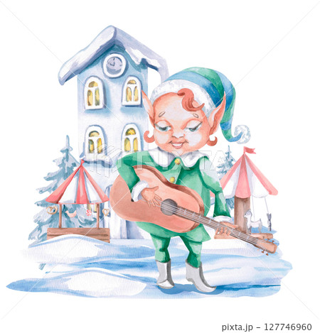 Christmas elf playing guitar against the backdrop of a New Year's fair. Isolated watercolor illustration on the theme of Christmas for the design of postcards, advertising posters, concert tickets.