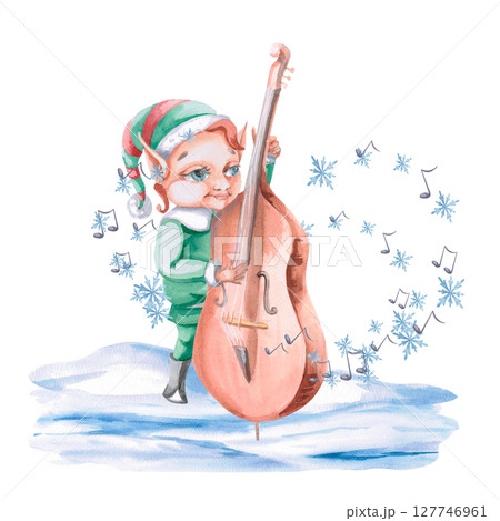 Christmas elf playing double bass surrounded by notes and snowflakes. Isolated watercolor illustration on Christmas theme for design of postcards, posters, advertising posters, concert tickets.