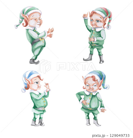 Set of 4 elves. Isolated watercolor illustration of characters for project decoration, children's products, Christmas cards, invitations for theme parties, children's interior design.