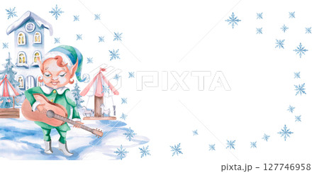 Rectangular frame with a Christmas elf playing a guitar. Isolated watercolor illustration on the theme of Christmas for the design of cards, posters, concert tickets.