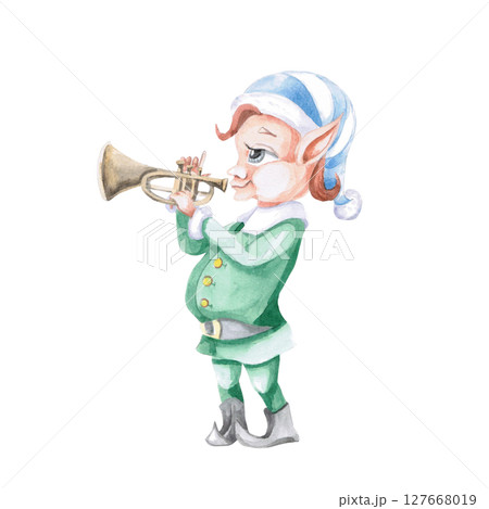 Christmas elf playing the trumpet. Isolated watercolor illustration of a fairy-tale character for the design of postcards, invitations, packaging, printing on posters, New Year's interior design.