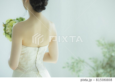 ウエディングドレスを着た黒髪ロングヘアの若い女性