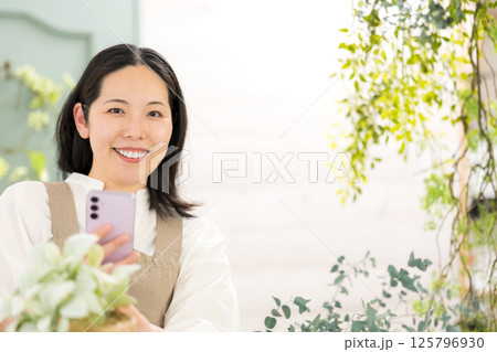 室内で植物を撮影するミドル女性|花屋園芸店教室イメージ|ウェルビー女子|ウェルビーイング
