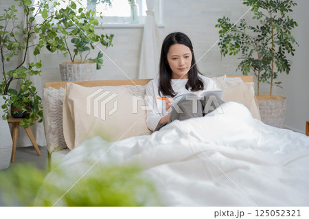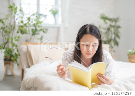 ベッドで読書をするきれいな女性|勉強|趣味|健康的な暮らしイメージ|ウェルビー女子|ウェルビーイング