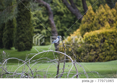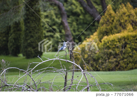カナダのヤマセミが枝に留まる様子 ウエストバンク-バ ブリティッシュコロンビア カナダ