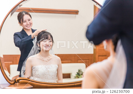 ブライダル,ウェディング,結婚式の準備をする花嫁とウェディングプランナーの女性(ベール)