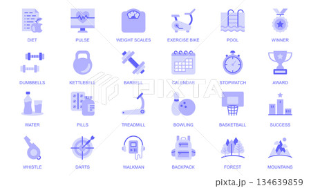 Fitness web icons set in duotone flat design. Pack pictograms with diet, pulse, weight scales, exercise bike, pool, winner, dumbbell, kettlebell, barbell, stopwatch, award, other. Vector illustration.