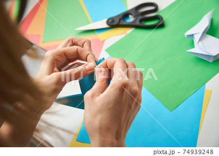 DIY concept. Woman make origami easter rabbit from color paper. Origami lessons