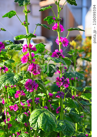 赤紫色のコモンマロウの花(夏、六月)