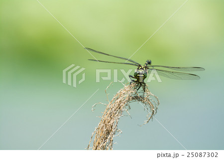 枯れ枝に止まるサナエトンボ科ウチワヤンマ♂
