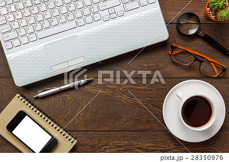Office table with notepad, computer, coffee cup and flower