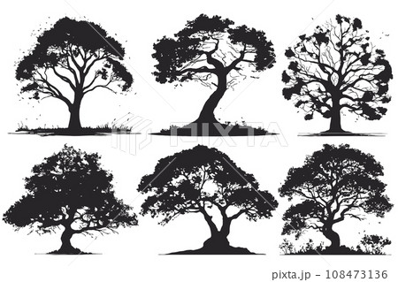 collection of big tree silhouettes in summer on isolated white background