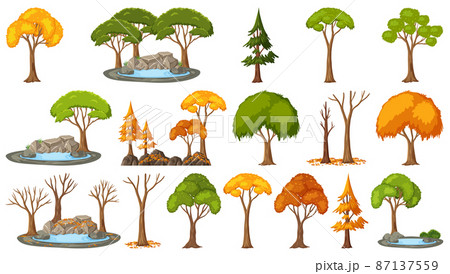 Set of trees with red leaves on white background