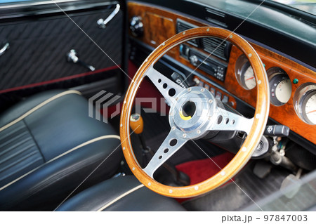 Interior of a classic vintage car with wooden details