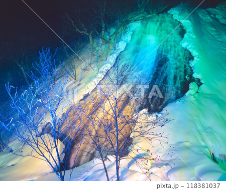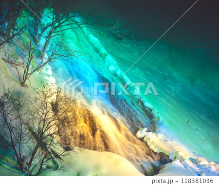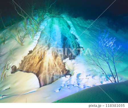 ライトアップされた冬のオシンコシンの滝 (斜里町ウトロ)