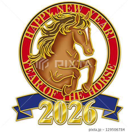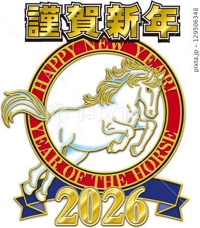 午年のイラスト_赤い輪_青いリボン_白い馬_2026年_謹賀新年