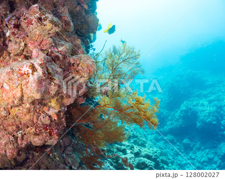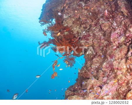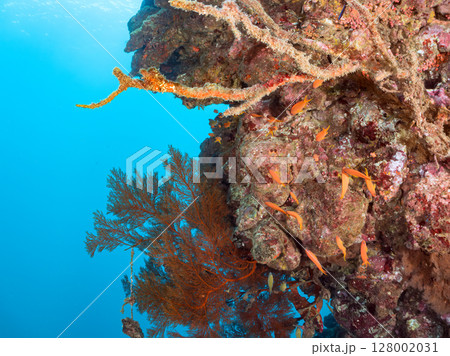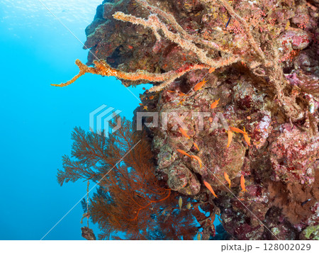 ウミカラマツが生えるドロップオフのキンギョハナダイ、ウメイロモドキ、キホシスズメダイ他の群れ