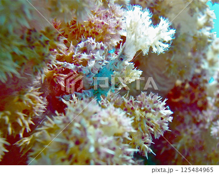 ウミトサカの林に住むイソコンペイトウガニ