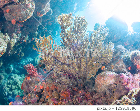 逆光のイソバナ、イボヤギ、カイメン他のソフトコーラル群。ヒリゾ浜中木南伊豆町伊豆半島静岡県2024