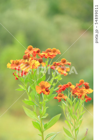 夏から秋に咲く朱色の花、ヘレ二ウム、緑バック
