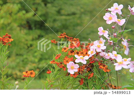 夏から秋に咲く朱色の花、ヘレ二ウムとピンクのシュウメイ菊、緑バック