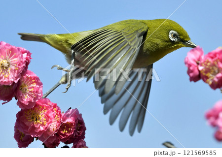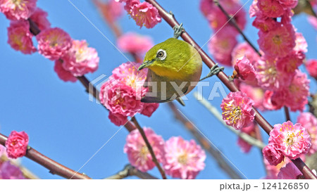 爽やかな春の空 満開の梅の花とかわいいメジロ