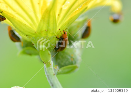 植物の葉にとまるクロウリハムシ(黒瓜葉虫)