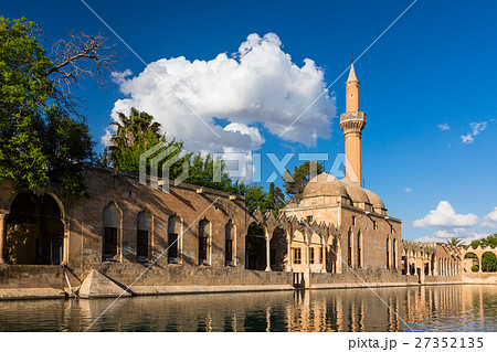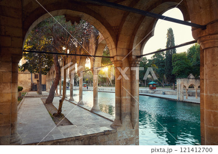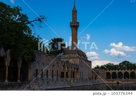 トルコ 夕暮れ時のシャンルウルファのバルックル・ギョルとルズワニイェ・ジャーミィ