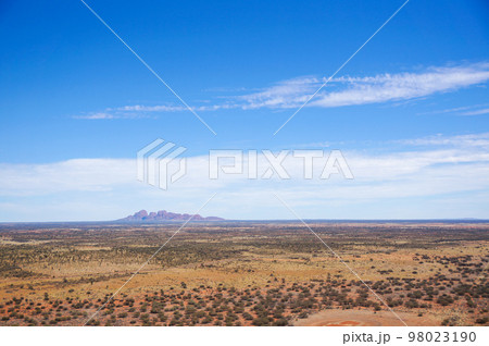 エアーズロック(ウルル)の頂上から望む地平線とマウントオルガ(カタ・ジュタ)