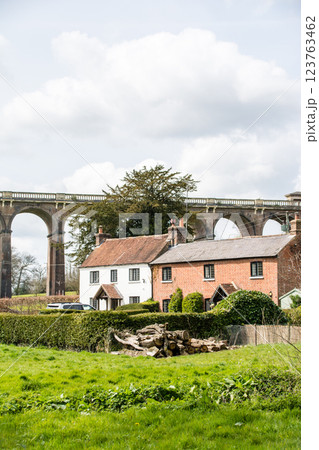 レンガ造りの歴史的な高架橋とレンガ造りの歴史的な家屋 ロンドンから南の郊外にあるオウズ渓谷にて