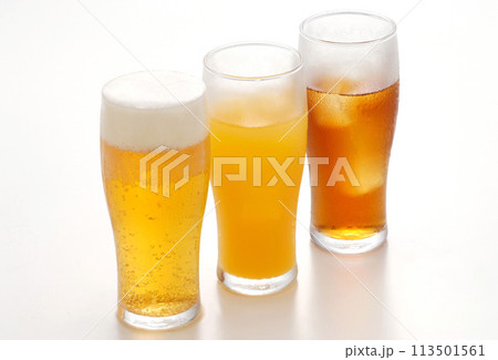 白背景でグラスに注がれた生ビール、オレンジジュース、ウーロン茶