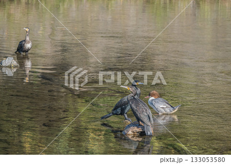 埼玉県川越市池辺 川越水上公園 修景池(ボート池)で翼を広げて羽干しをするカワウ(河鵜)の群れ