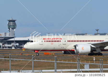 日本の千葉都市景観 成田空港第2からエア・インディアの旅客機B787-8やJALB787…などを望む