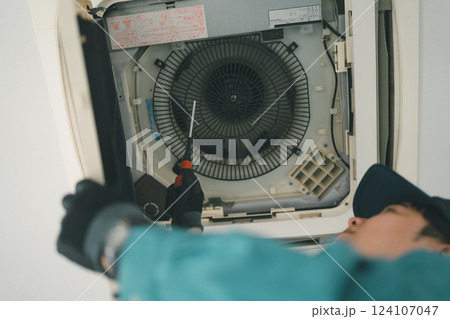 エアコン・空調設備の清掃をする作業着の男性(後ろ姿)