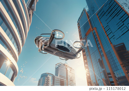 未来都市を飛行する空飛ぶクルマと青空の風景