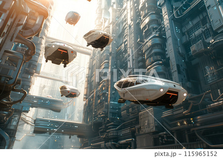 大都市のビルの隙間を飛ぶ複数の空飛ぶクルマ2